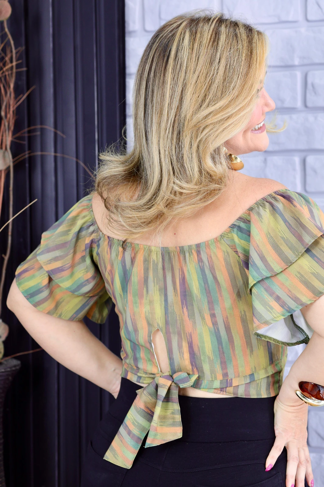 Blusa ombro a ombro multicolorida com estampa de listras. Crop suave, decote reto e mangas curtas com leve babado, conferindo feminilidade sem perder a praticidade. Tecido leve e macio proporciona caimento confortável do dia à noite. Perfeita para looks casuais ou para compor produções modernas com jeans, saia ou short.